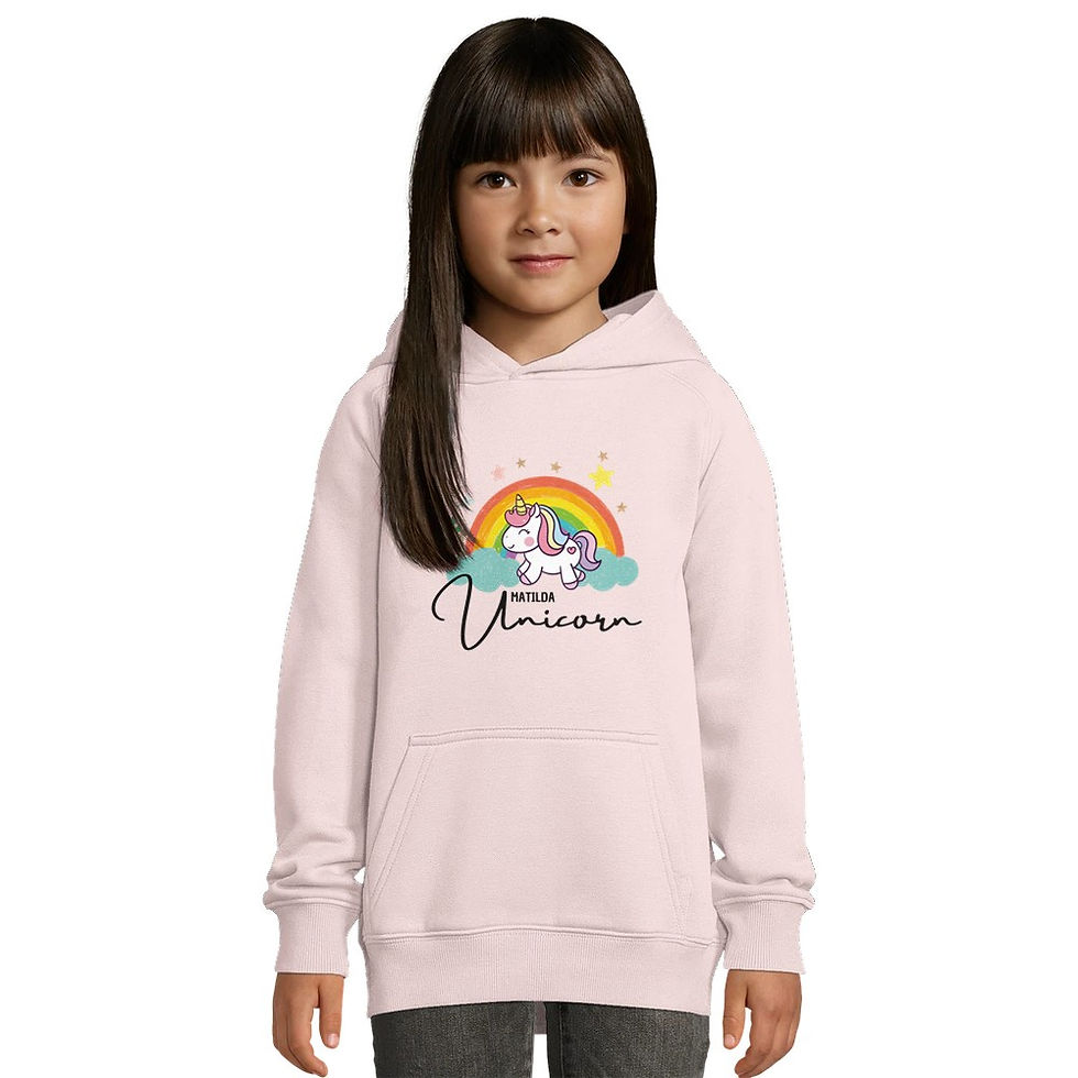 Personalisierter Kinder Hoodie aus Bio-Baumwolle - Einhorn und Regenbogen